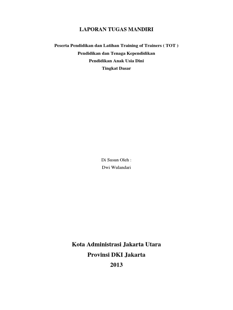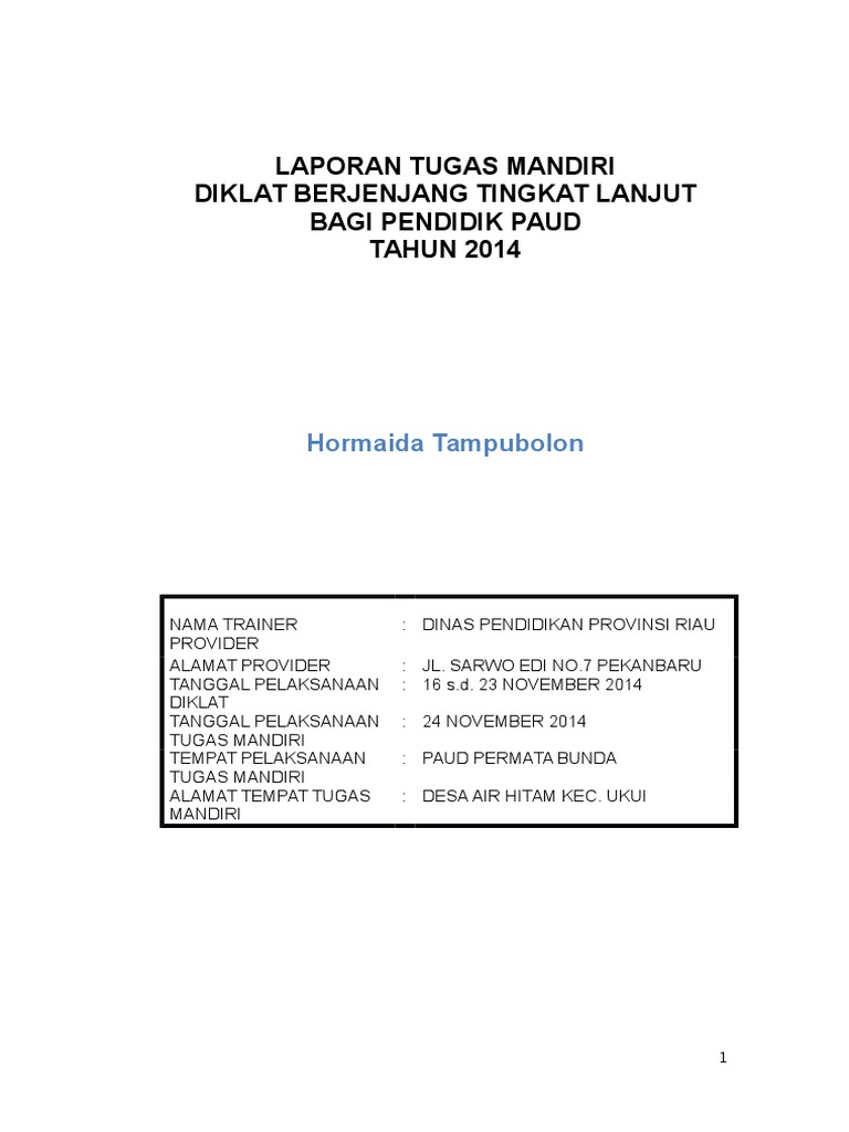Arial ukuran huruf 18, warna biru. Contoh laporan tugas mandiri pcp paud. Tanggal pelaksanaan tugas mandiri : Kami mengucapkan banyak terima kasih kepada semua pihak yang telah membantu kami untuk menyusun laporan ini. Diklat berjenjang tingkat dasar bagi pendidik paud.